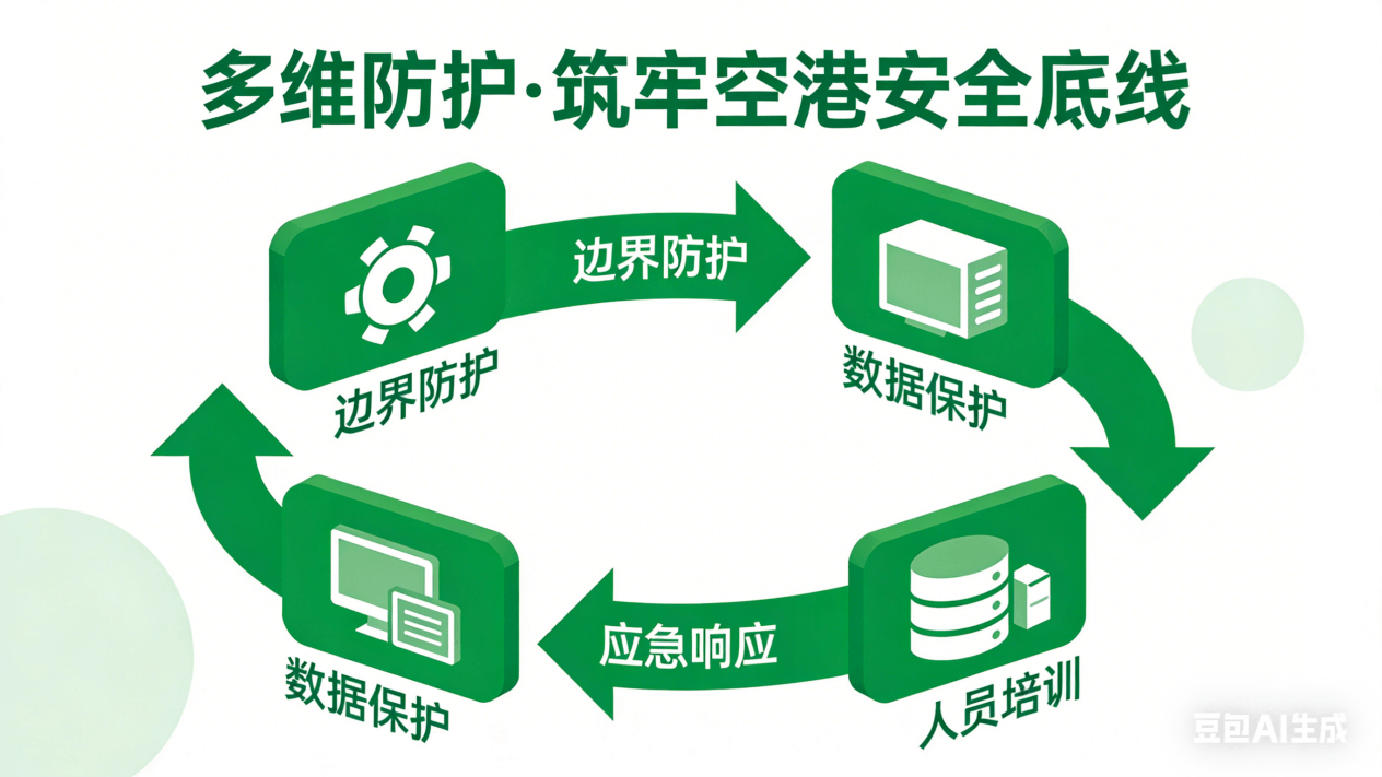 機(jī)場(chǎng)安全是運(yùn)營(yíng)的底線,信息安全體系架構(gòu)圍繞兩大平臺(tái)、兩個(gè)維度、三個(gè)安全技術(shù)層面、四個(gè)安全管理層面搭建,全方位保障機(jī)場(chǎng)信息安全。